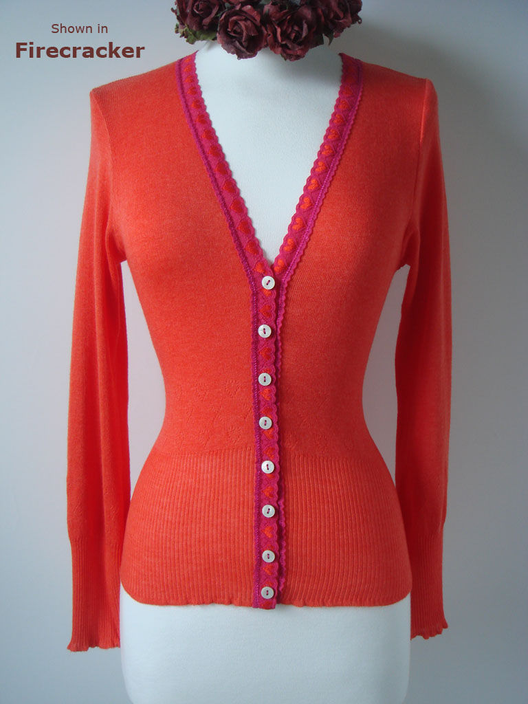 Currently shown here in 3 timeless shades, this seamfree cardigan features our pretty contrasting Fuchsia Heart Lace trim and fine rib detail at the hem and cuffs.